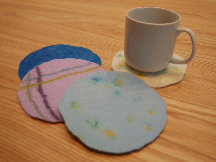 ブレンドした羊毛を使用しますので、水彩画のような不思議な仕上がりのコースターができますよ。