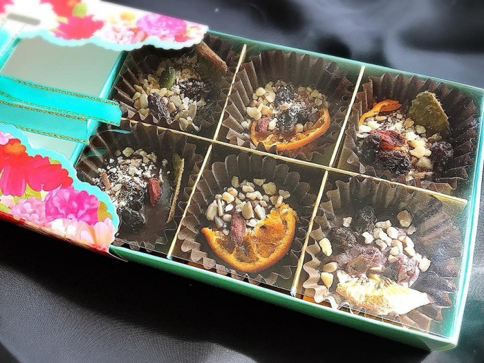 生のナッツを乾燥させたもの、ゴマ、ドライフルーツを使って作るチョコレートは、