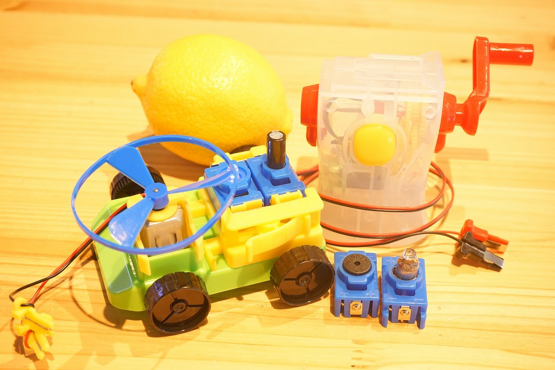 また、レモンを使った実験レモン電池(レモンでんち)は、レモンの果実に亜鉛板と銅板を差し込んで作る簡易な電池です。 銅板と亜鉛板が電極、レモンに含まれている果汁が電解液となって電力を発生します。この仕組みを利用してコンデンサーで充電し、エコカーを動かします。当日は講師の中村先生のレクチャーのもとエコカー作り体験してもらいます。