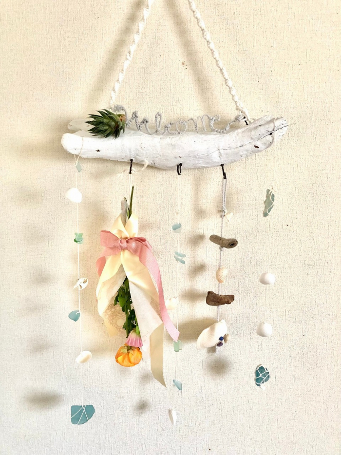 流木にフックをつけることでスワッグやシーグラスを飾ることができ、