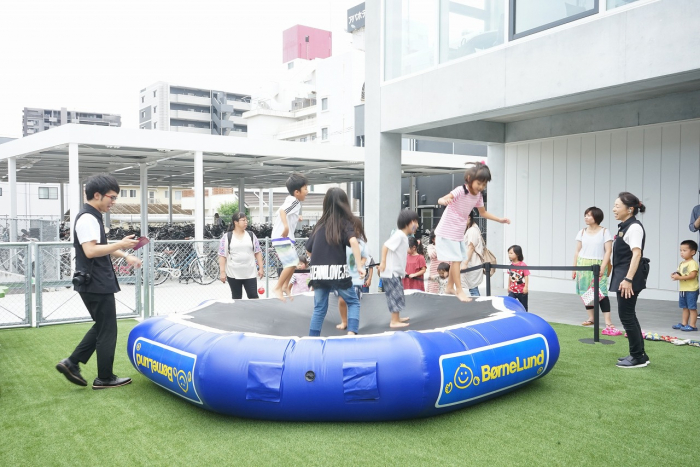 キッズガーデンでトランポリンで遊びます。トランポリンでの遊びを通して子どもたちの運動促進に繋がります。