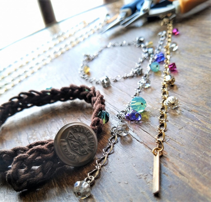 チェーンやコードで作られた基本のブレスレットに選んだパーツを装飾していきます。パーツはチェコビーズや天然石、シルバーチャームなど盛りだくさん!後半はコードブレスレットも追加します。