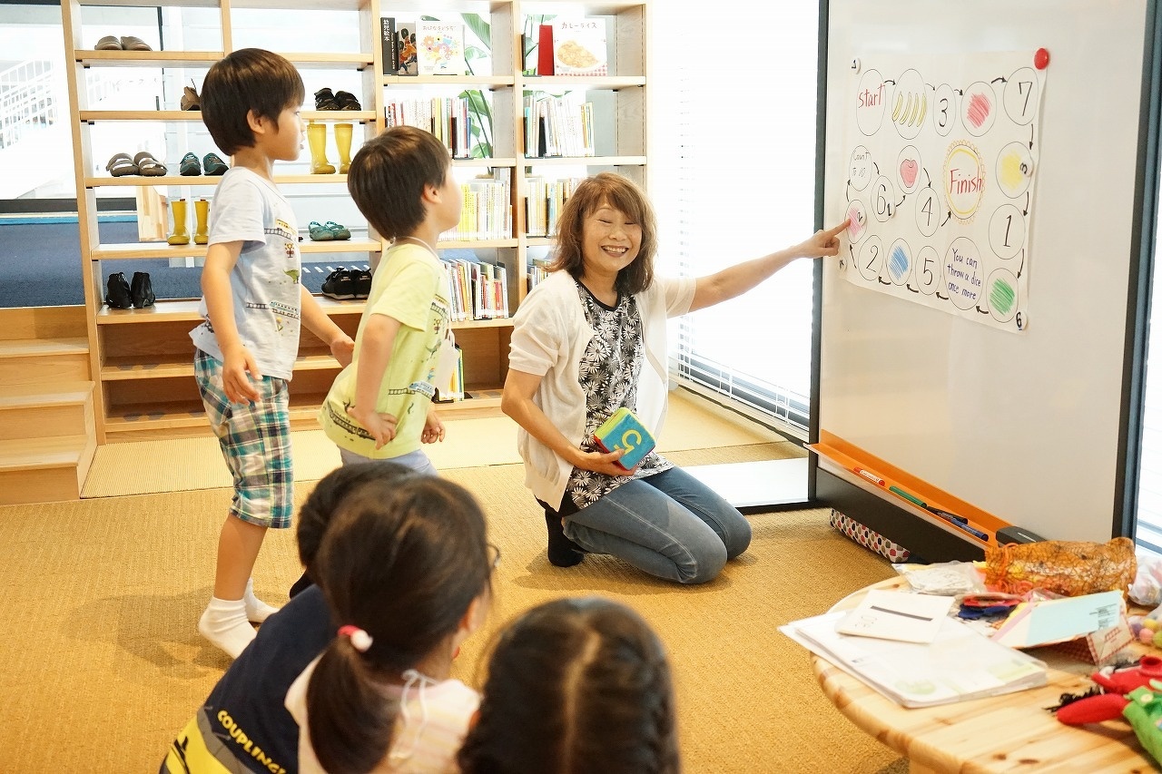 恵子さんは、元気いっぱいの子どもたちと会話をしながら、一人一人に合わせて進めてくださっています。
