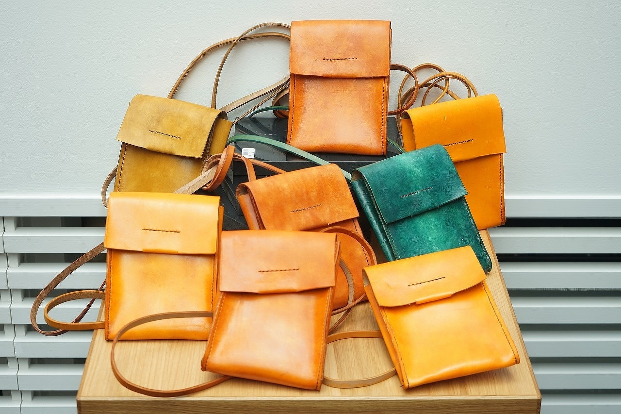 写真は既製品ではありません。7月に行われた「第4回大人のものづくり教室」で参加された皆さんが作った本革のポシェットです。