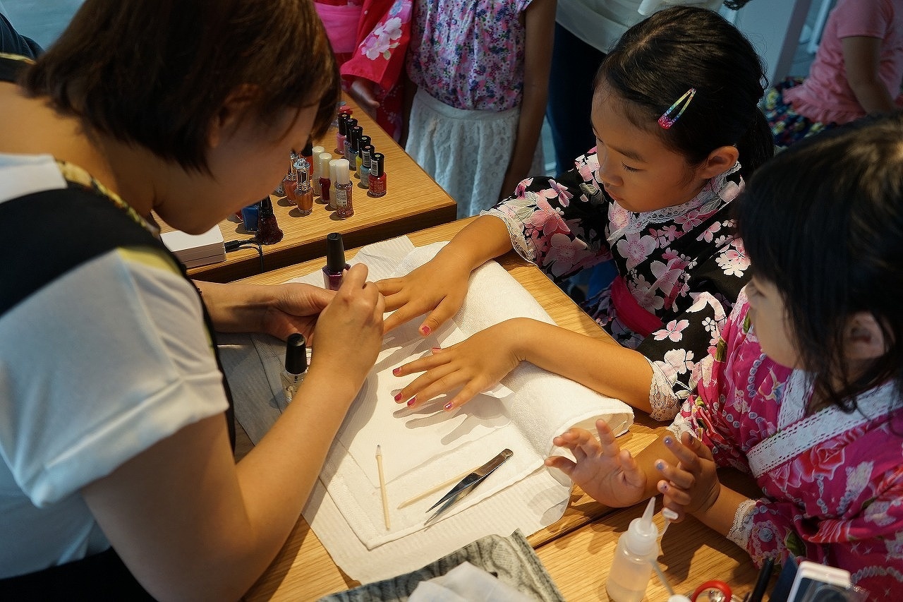 さらに、延岡市の市街地で行われる「まつり延岡」の当日に行うことで、ネイルを最大限に楽しんでもらえるようにしました。そのため、当日は浴衣を着た可愛い女の子たちの姿が多く見られ、キッズスペースもいつもより華やかでした。