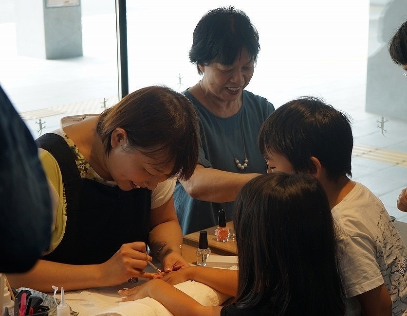 夏休みに入り、館内にたくさんの子供達の姿が見られたこの日、キッズスペースにてキッズネイルのイベントが開催されました。今回のイベントは予約制ではなく、キッズスペースの一部にブースを作り、当日に随時受付を行うという流れで行われました。
