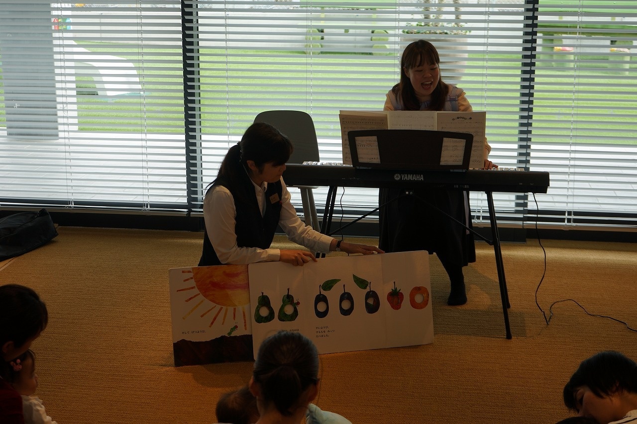 「はらぺこあおむし」の大型絵本で読み歌い。こどもたちは絵本に近づいてさわったりめくったしながら、渡部さんの弾き語りで楽しんでいました。