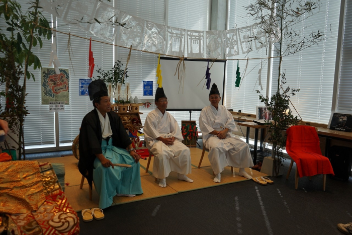 14時より学習席スペースを神楽の舞台にしつらえて、「延岡神楽の楽しみ方」を開催いたしました。
