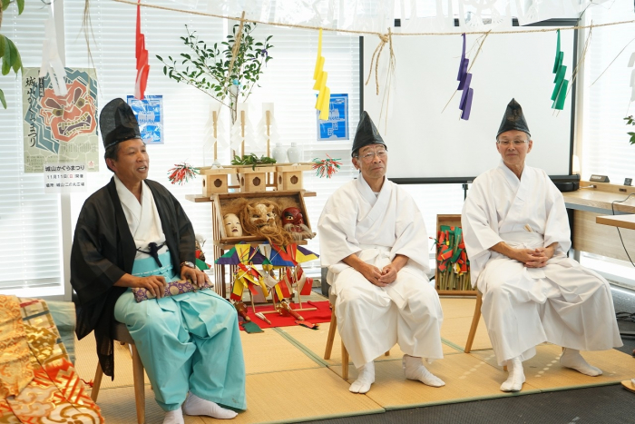 その城山神楽祭実行委員会から、山﨑洋一さん、黒木弘一さん、松田勝則さんにお越しいただき、実演を交えながらお話をしていただきました。
