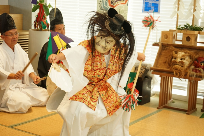 クライマックスは大峡神楽の「三番荒神」の実演です。小学5年の深田奏さんが力強く舞ってくれました。