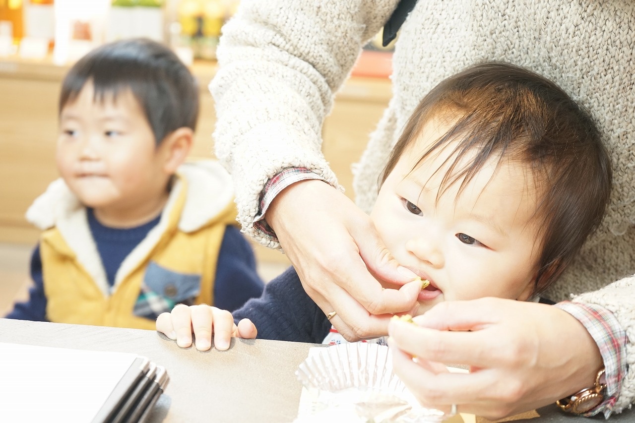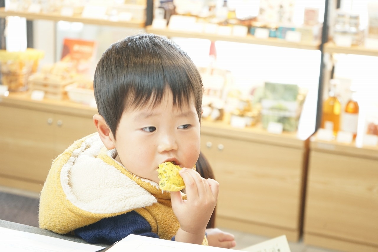 初めにキッズスペースで、食生活改善推進員の方が紙芝居を読んでくれました。「ニンジン忍者」と「にんにんまる」です。子供たちは真剣な表情です。紙芝居が終わったらキッチンスペースに移動して、わかめ入り蒸しパンを食べてもらいました。材料はホットケーキミックス、南瓜、卵、牛乳、乾燥わかめです。