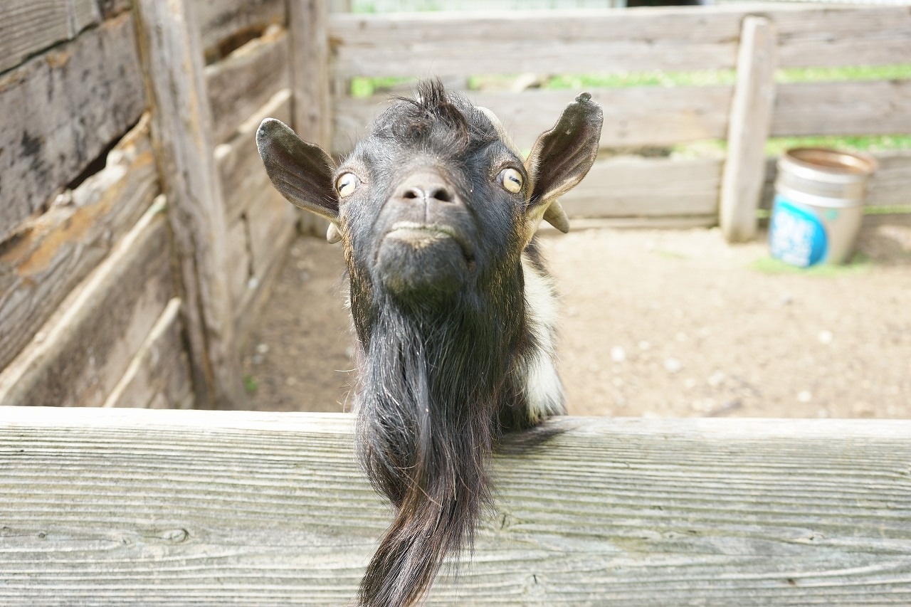ぴょんっぴょんっと跳ね回るヤギが、鼻を近づけてきました。一見ブサイクですがよく見ると、愛おしく思えてきます。