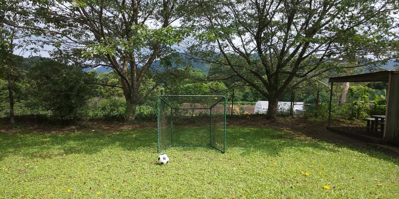 次はミニサッカー。新緑をバックに、気持ち良い風に吹かれつつ、スタッフもお互いじゃれあうかのようにゴールを狙います。シュートは入っても外れても笑顔にしかなりません。