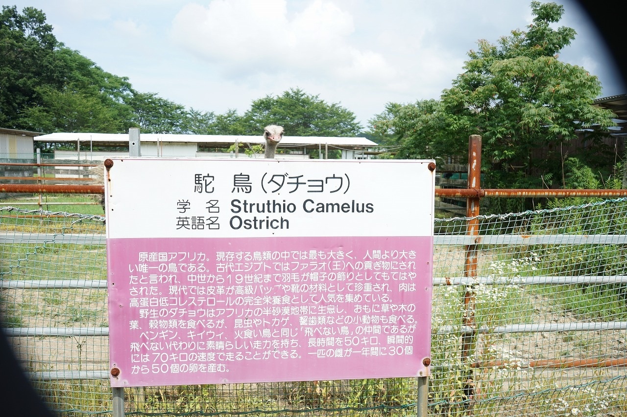 さわやかな初夏の風を感じつつ、気分もリフレッシュしたいので今回は貝の畑町のダチョウ園にいってきました。園内に入ると、さっそくダチョウがお出迎え。駝鳥(ダチョウ)と書かれた看板の上に顔を出したところを、パシャリ。