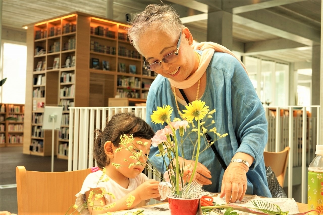 子どもたちが自由に活けている横では、大人の女性たちも談笑しながら参加していました。