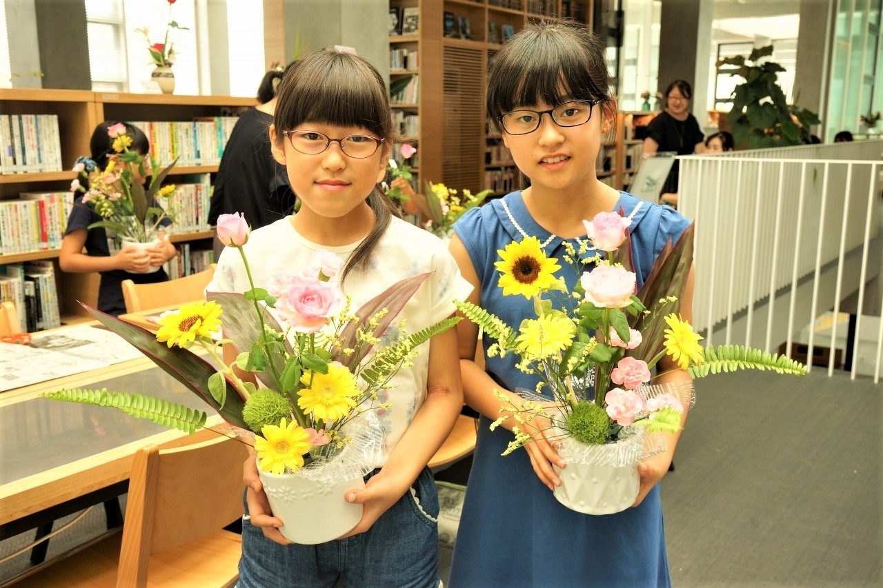 完成したいけばなを手に、並んで写真を撮らせてくれた女の子たち。