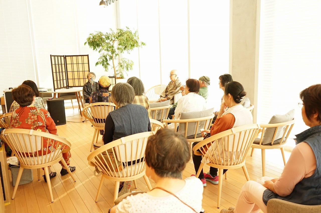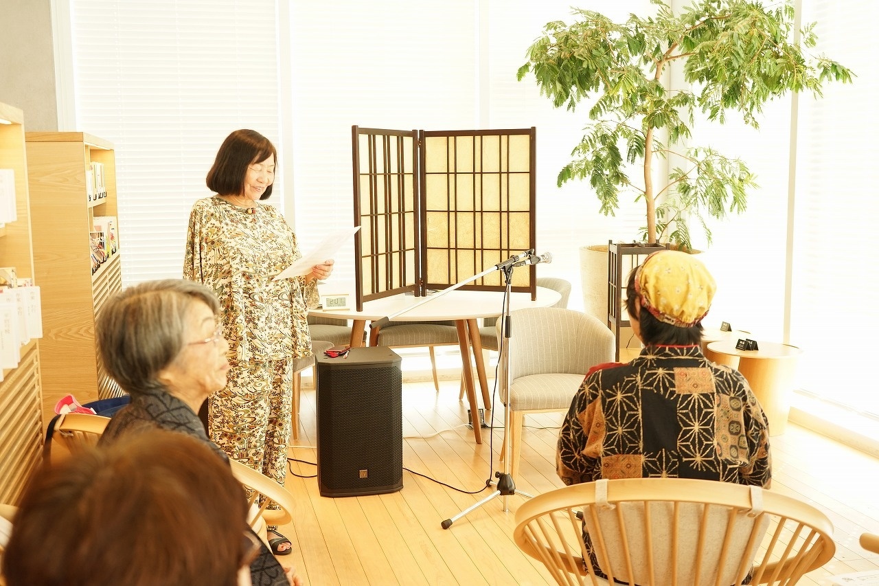 室内を語りの部屋にしつらえ、二階中央大ラウンジはいつもと違う雰囲気に包まれました。早くに足を運んでくださった方たちからは、開幕されるのを今か今かと心待ちにしている様子が見受けられました。そして待ちに待った午後14時。『延岡語り部 萌ぎの会』会員・山内さんの進行のもと、「エンクロス語りの部屋」がスタートです。