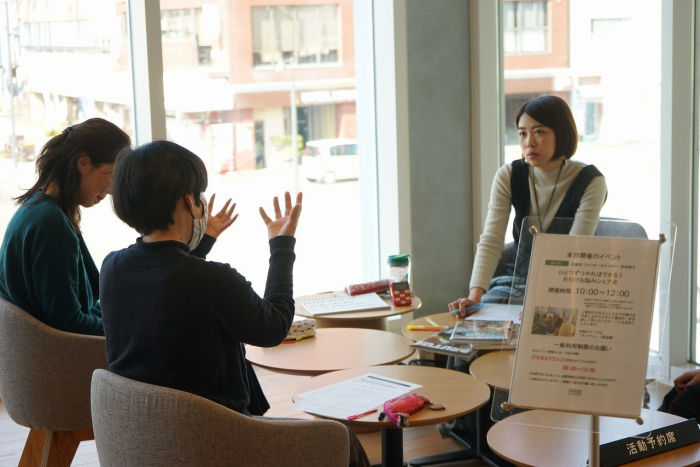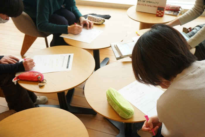 記入したワークシートを中心に、片付けの悩みを順番に話していきます。悩みをシェアする時間が増えるほど、「キッチンの片付け」の話をしていたはずが、洗濯物の片付け、お弁当づくり、子供の一人暮らしなど、話は次々に広がっていきます。吉田さんも片付けの話に集中するわけではなく、日ごろの悩みについて参加者の皆さんとシェアをしていきます。