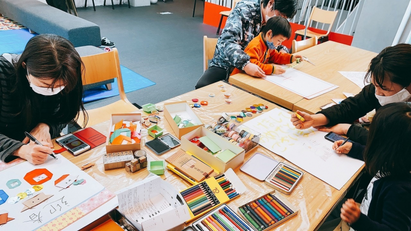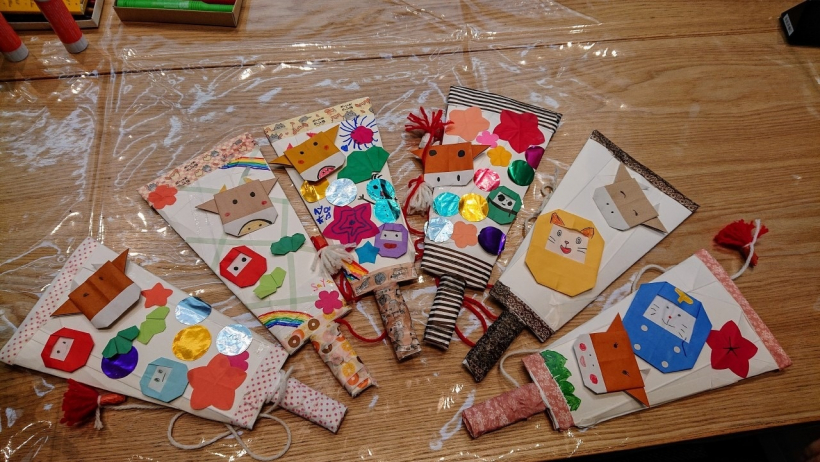 親子で自由にカラフルなマスキングテープや折り紙、ペン使って飾り付けをして
