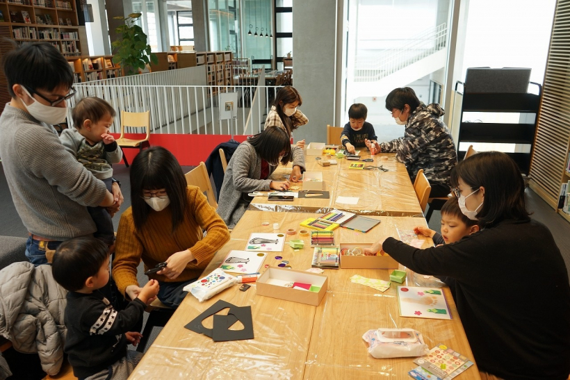 足形年賀色紙と巨大年賀状づくり、羽子板づくりの物づくりスペースや