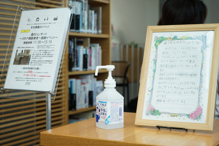 8月10日までは、館内各所にて市内の小中学生が書いた医療従事者への感謝のメッセージを展示しています。