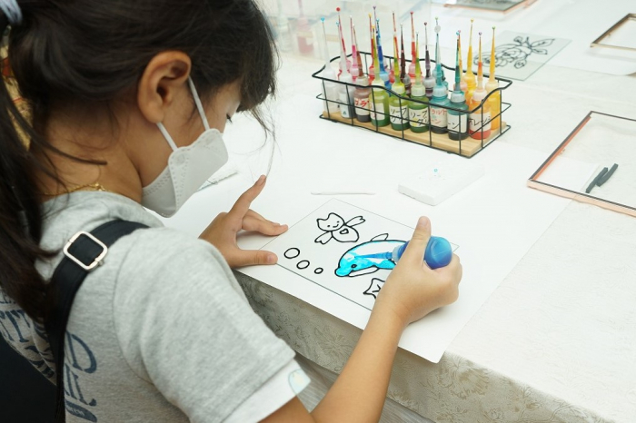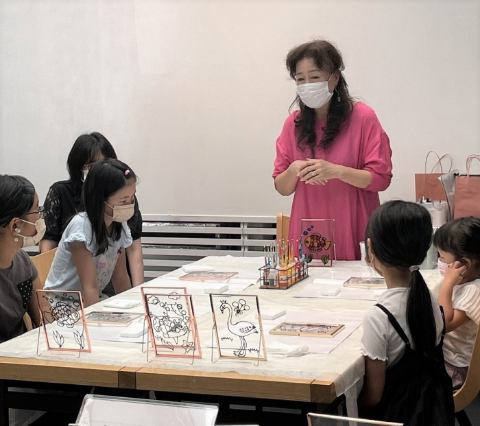 絵柄を描く時に使われている絵の具は、色を塗る時に使っているものとは違う性質で、色は黒以外にも白や金、銀もあるとのこと。吉岡さん自身も金色が好きで、普段描く時にはよく使っているそうです。ただ、黒以外の縁取りだと色を塗るのが少し難しいようで、初めての方には黒をおすすめしているそうです。