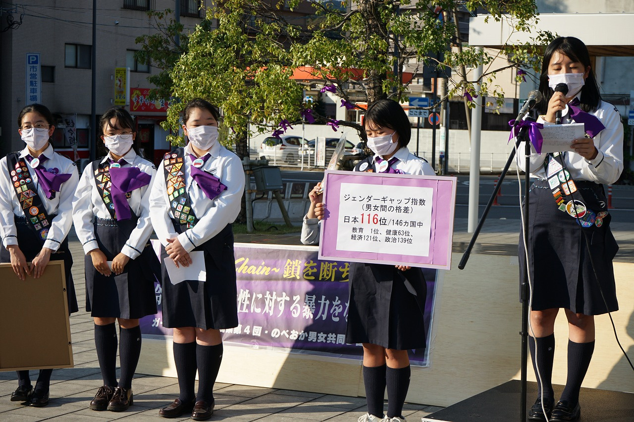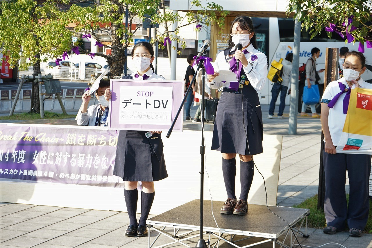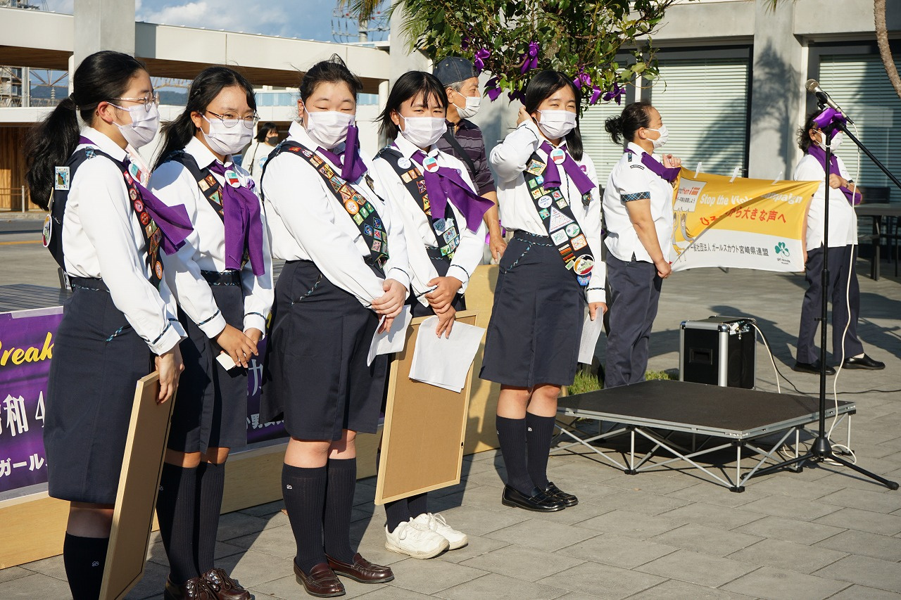 ガールスカウト延岡協議会のみなさんは、家庭内での男女平等=家族みんなが協力しあうことで、感謝する気持ちが生まれ、お互いを尊重することにつながるとまとめ、学校やSNSでの発信を通して、自分たちにできることをこれからも続けていくと伝え、スピーチを結びました。