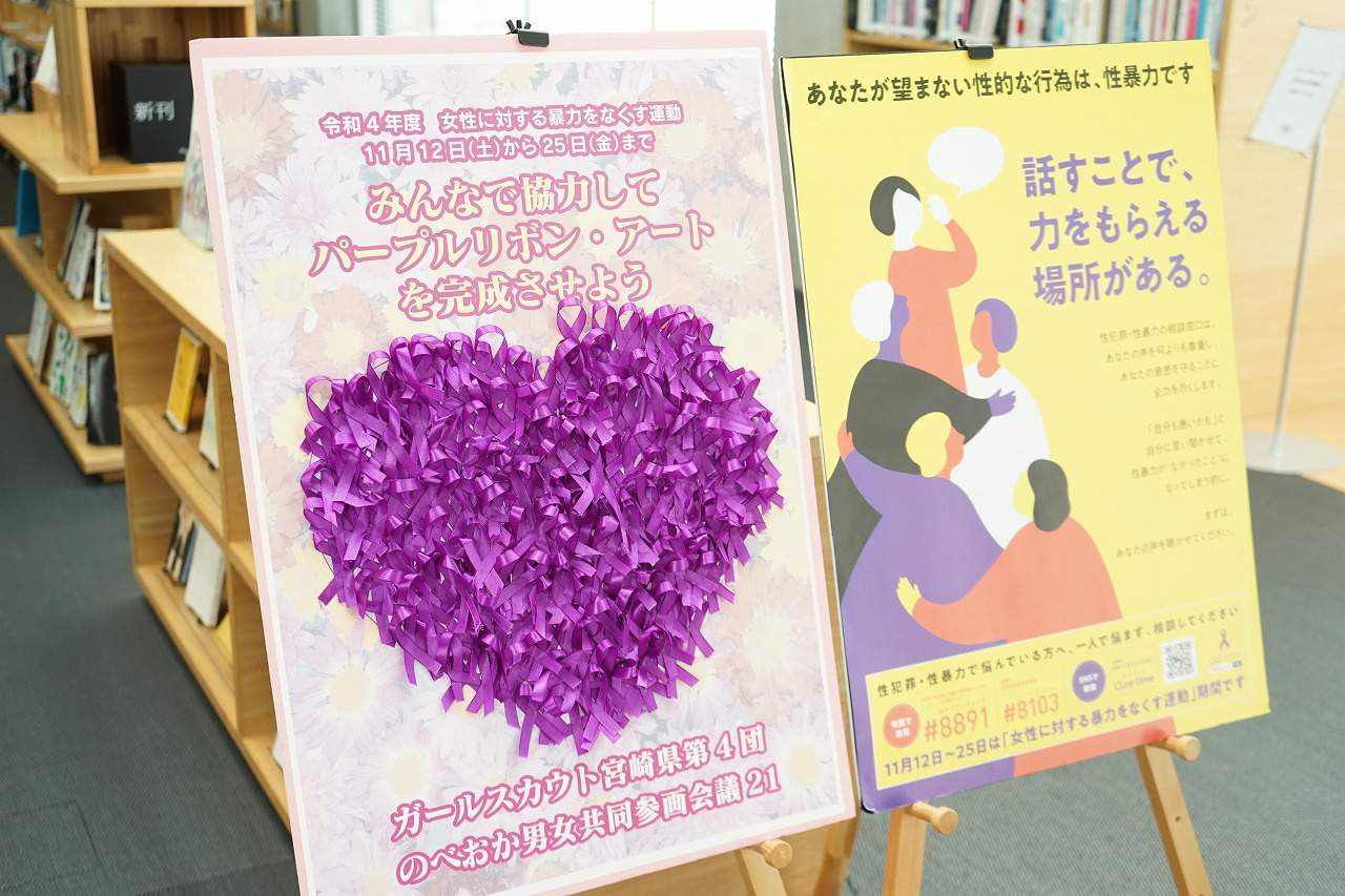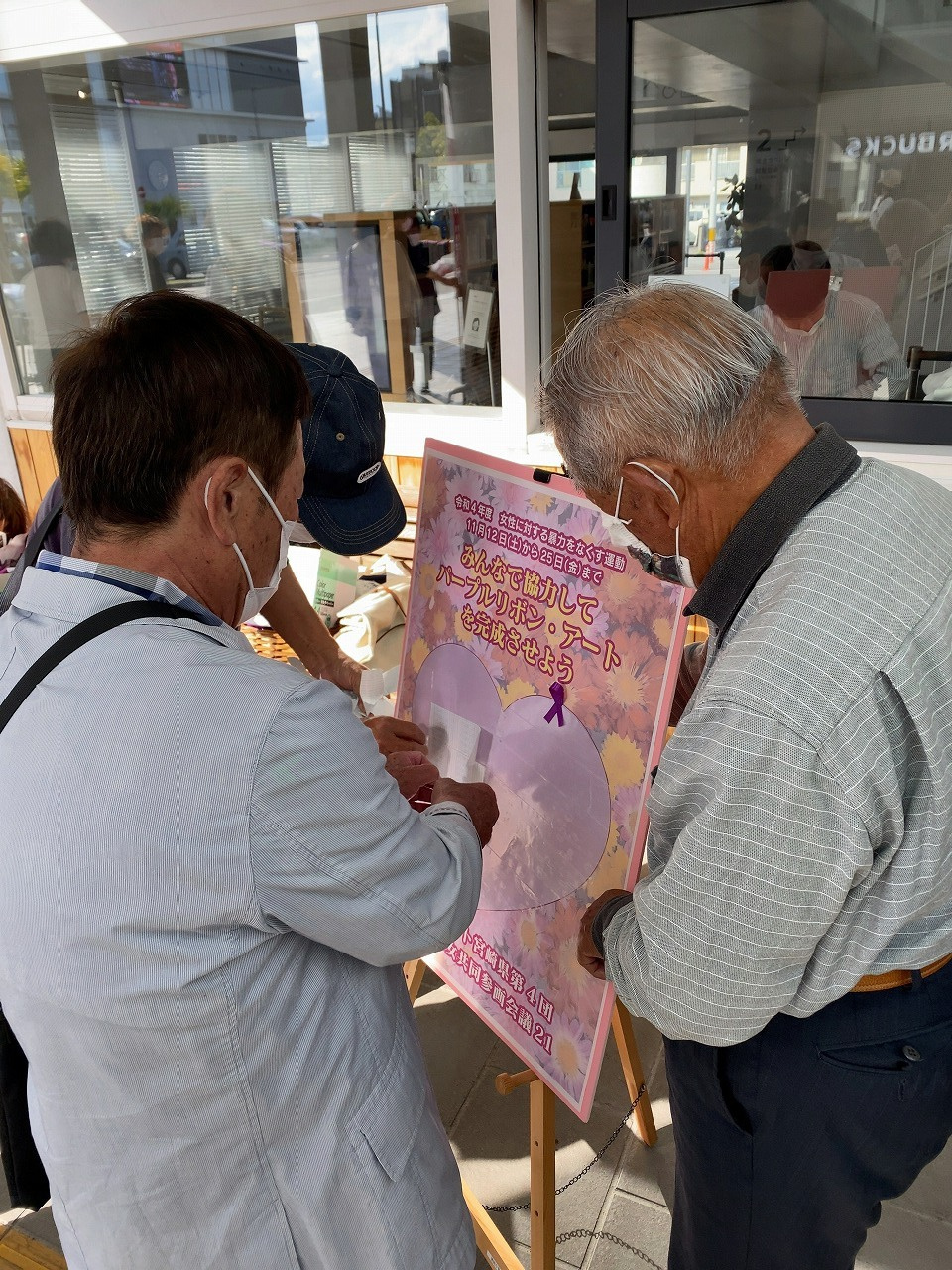 のべおか男女共同参画会議21のみなさんは、啓発グッズの配布や来館者とともに作成するパープルリボンパネルアートを行いました。