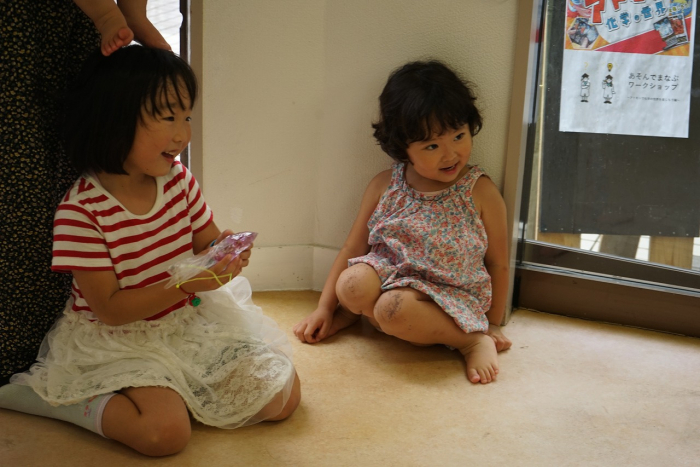 ひらがなをくっつけてことばを作るゲームでは、未就学のお子さんたちが、ほぼ大人の力を借りながら、何が起きているかわからない様子で進めていく姿に周囲も思わず笑顔。