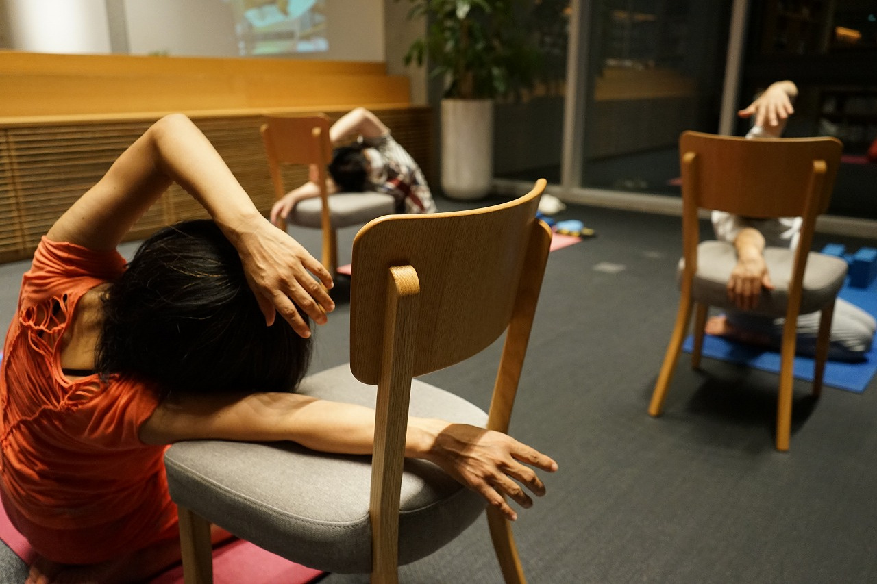 呼吸を意識しながら、椅子を使った動きやヨガマットの上で行う動きを行い、日々の疲れをゆっくりリフレッシュしていきます。