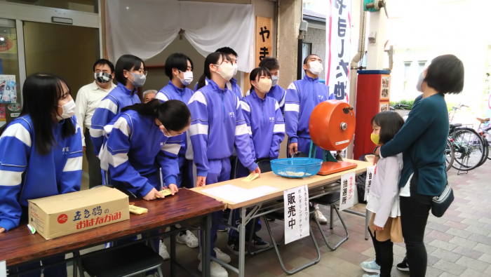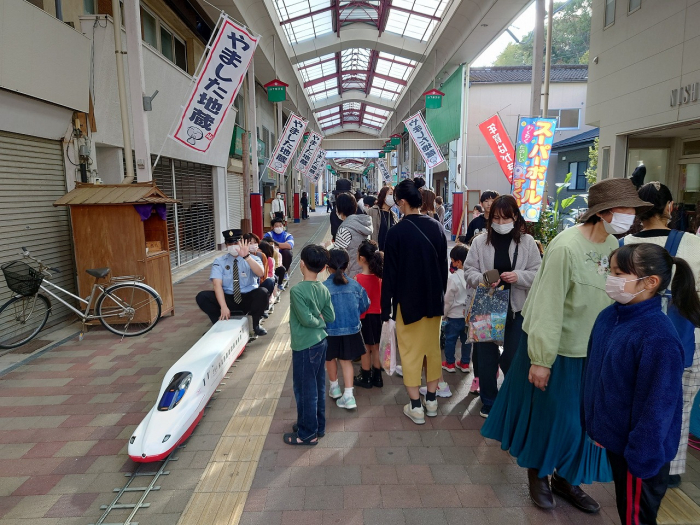 新天街のほうでは、岡富中学校の生徒さんたちもボランティアとして駆けつけ、ミニ新幹線の受付やガラポンの抽選を行っていました。ガラポンでは残念ながら外れてしまったお子さんを見て、全員で「あちゃー」と残念がる中学生の可愛らしい一面も。