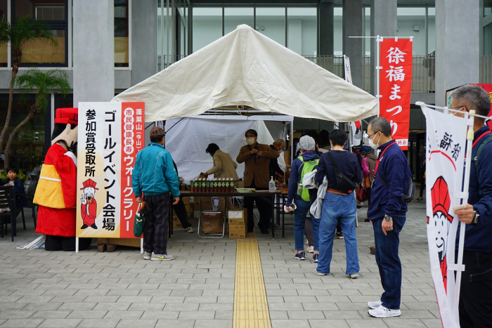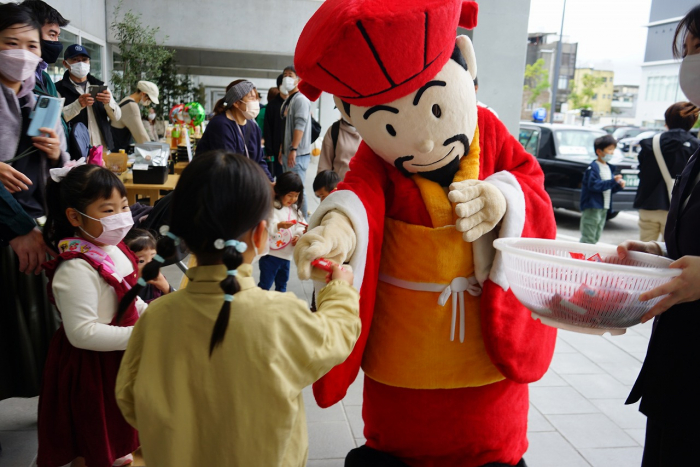 そんなかもめの隣では『徐福くん』によるお菓子のふるまいが行われていました。延岡の街をめぐるウォークラリーイベントのゴール地点となっていたエンクロス。ウォークラリーには若者からご年配の方まで幅広い年代の方が参加しており、徐福くんに迎えられてのゴールとなりました。