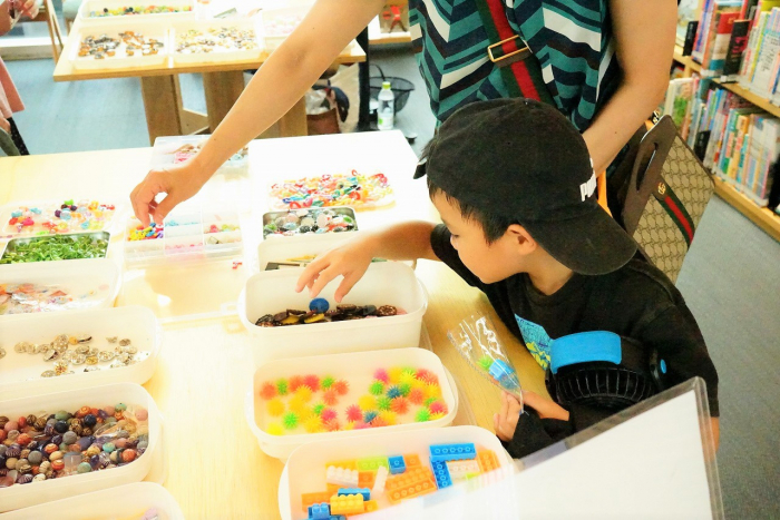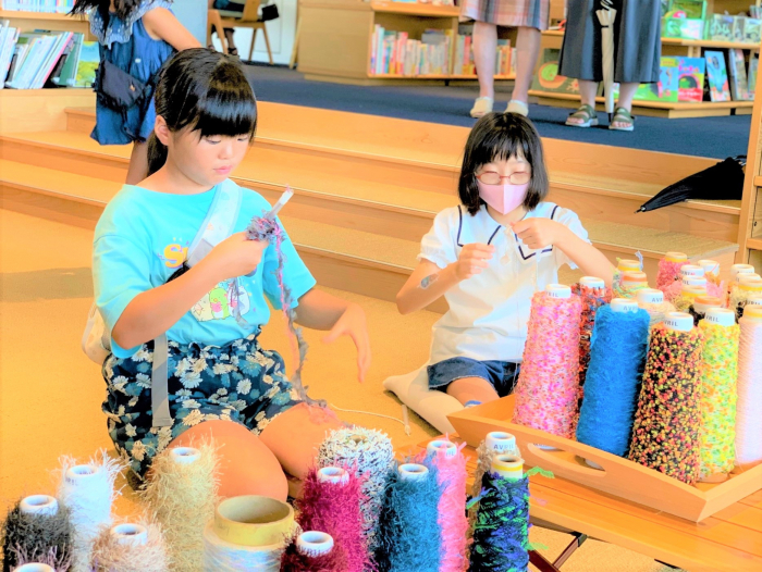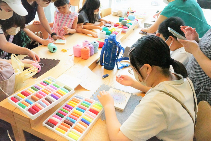 いろいろな色や手触りの糸が勢ぞろい。子どもたちは目移りしながら楽しそうに選ぶと、自分だけのシュシュ作りに熱中していました。(誘い人:hiro-gare)