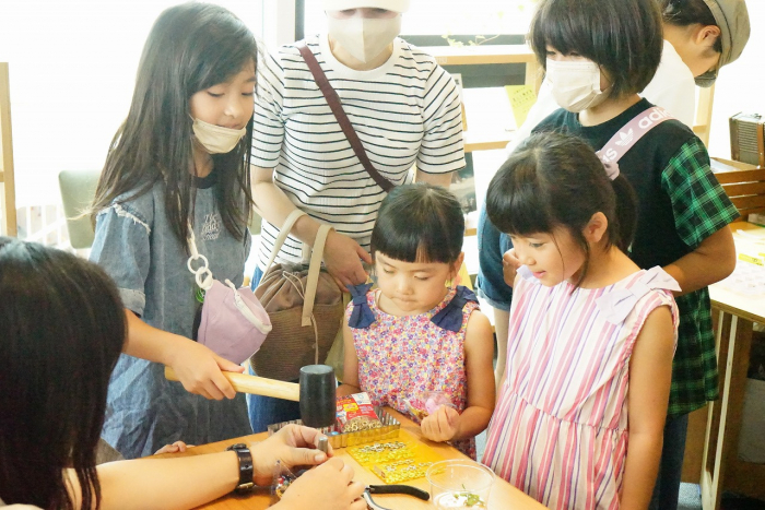 ときおり「トン、カン、トン…」と響くトンカチの音に誘われて子どもたちがやってきます。自分でやるのはドキドキするみたいだけれど、上手に叩けていました。(誘い人:ちろぺこ雑貨店)