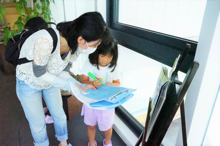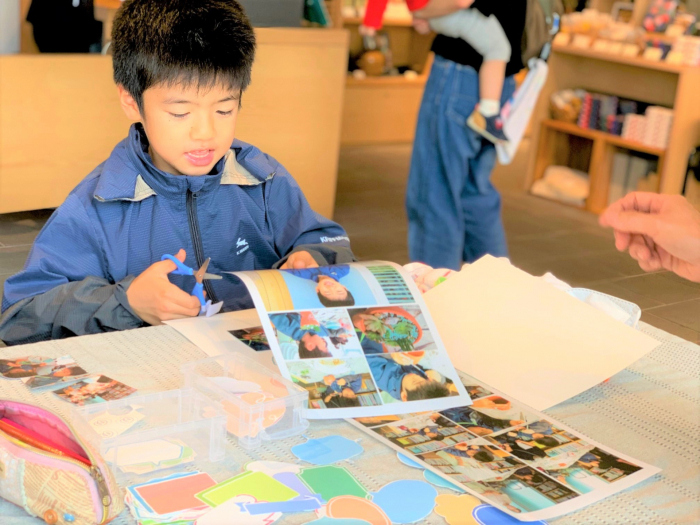 プログラム参加中の様子をエンクロススタッフが撮影しました。そのなかから気に入った写真を見つけて、とてもうれしそう。専用の台紙に写真や吹き出しを切り貼りして、思い出を振り返りながらコメントを考えれば、自由研究の完成です。(企画:エンクロス)