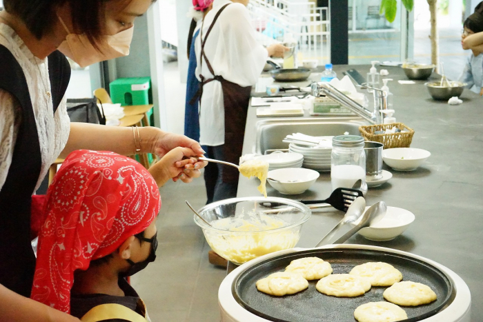 真剣な顔で生地をとり、ゆっくり並べて焼いていきます。ふわふわのパンケーキになりますように。(誘い人:Hawaiian Café WIKIWIKI)