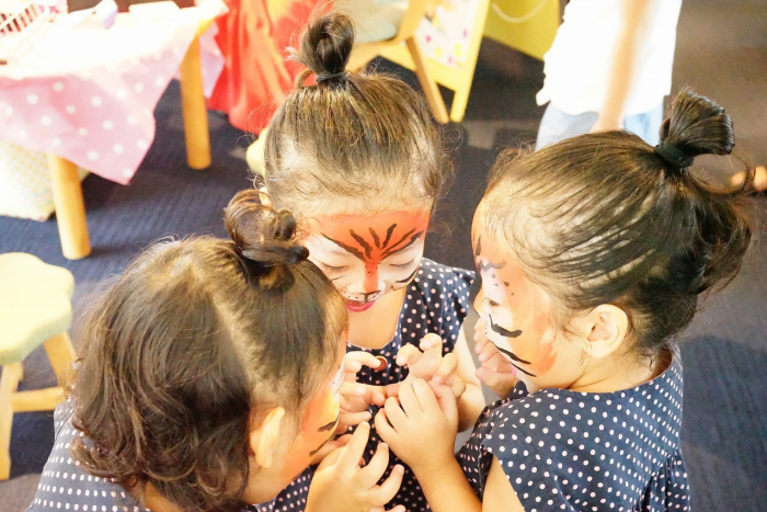 お揃いのフェイスペイントをしてもらった三姉妹はポーズもお揃い。周りの大人たちから「かわいいね」と声を掛けられてご機嫌です。(誘い人:アーナー恵子)