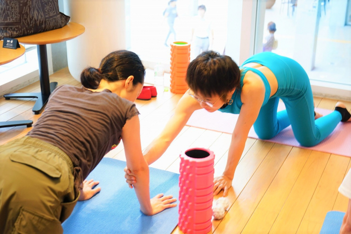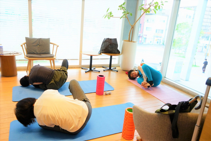 解放感のあるガラス張りのフロアにヨガマットを敷き、足首や足の指を揉むように動かしてほぐしたら、いよいよスタートです。