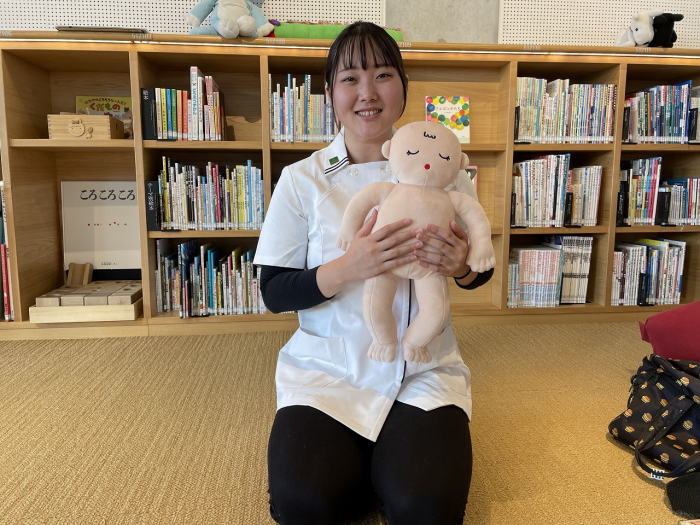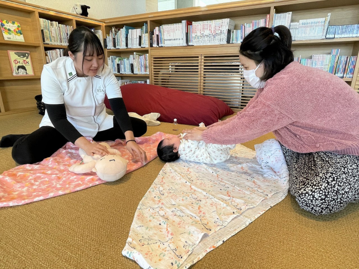 おくるみはまだやったことがないということで、練習をすることに。