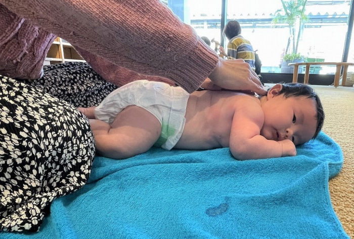 今回参加してくれたのは生後二か月の赤ちゃん。まだ慣れないうつぶせに苦戦しながらも、マッサージが終わるまで一生懸命頑張っていました。