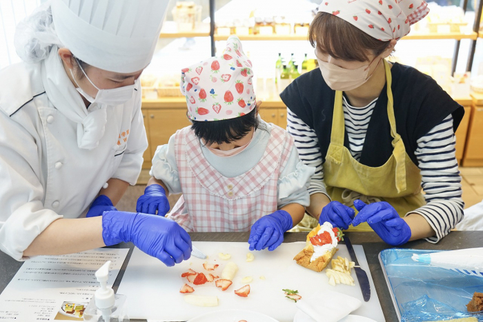 つぶさないように手に取りクリームを絞ろうとするのですが、クリームが少しかためでスムーズにでてきません。そんな様子を隣で見ていたお母さんはお子さんをサポートし、一緒にクリームを絞りだします。