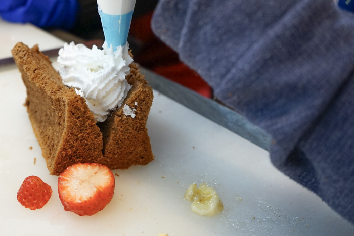 果物を切り終えたら、次はシフォンケーキにクリームを絞っていきます。