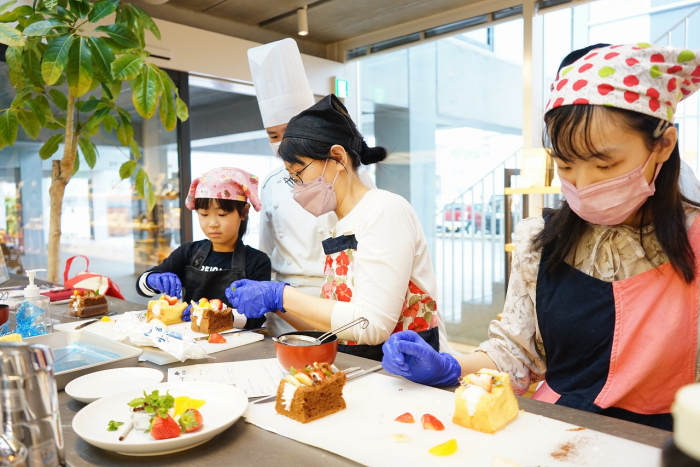 見た目のバランスを考えつつ、手前にのせようか、奥にのせようか、やっぱりこっちかな。と、参加者は首をかしげ悩んでいたり、シフォンケーキとにらめっこしたりしています。