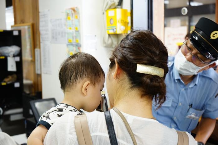 切符を切るのではなく、切符にハンコを押すお仕事ですが、子どもたちは駅員さんになったような気持ちで、ご家族の切符を切っていきました。