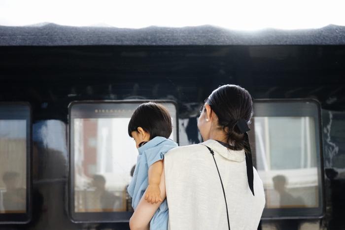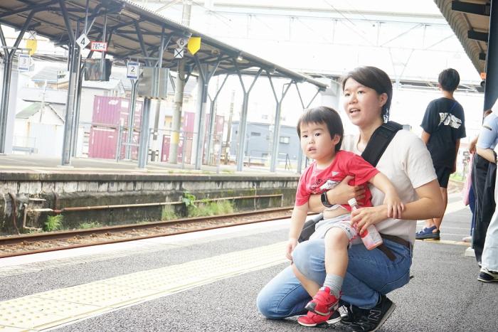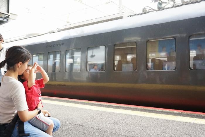 九州の限られた駅にしか停車しないめずらしい電車。またとない機会を逃すまいと、子どもだけではなく保護者の方も目に焼き付けました。