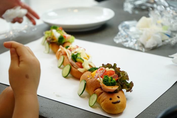 お腹が空き始める11時半。おはなし会を楽しんだ参加者の皆さんは、キッチンへ移動。おはなし会で読まれた「サンドイッチでんしゃ」を作ります。