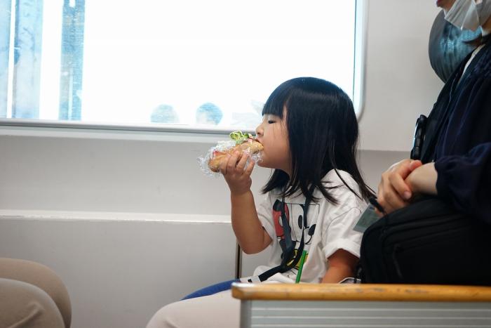 完成したサンドイッチを持って向かう先は電車の中。停車中の車両を借り、ピクニック気分でサンドイッチを食べます。