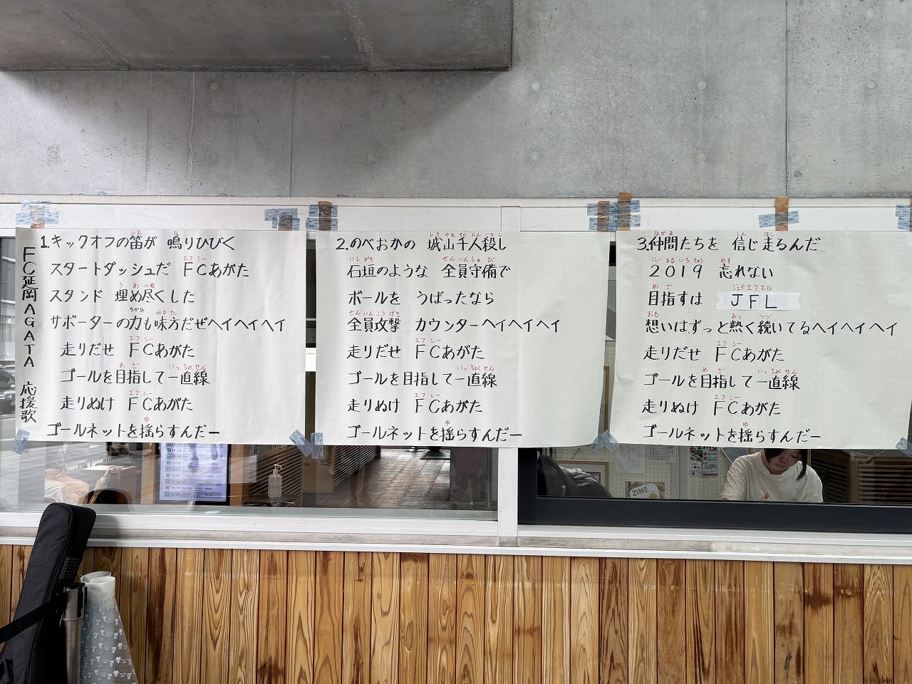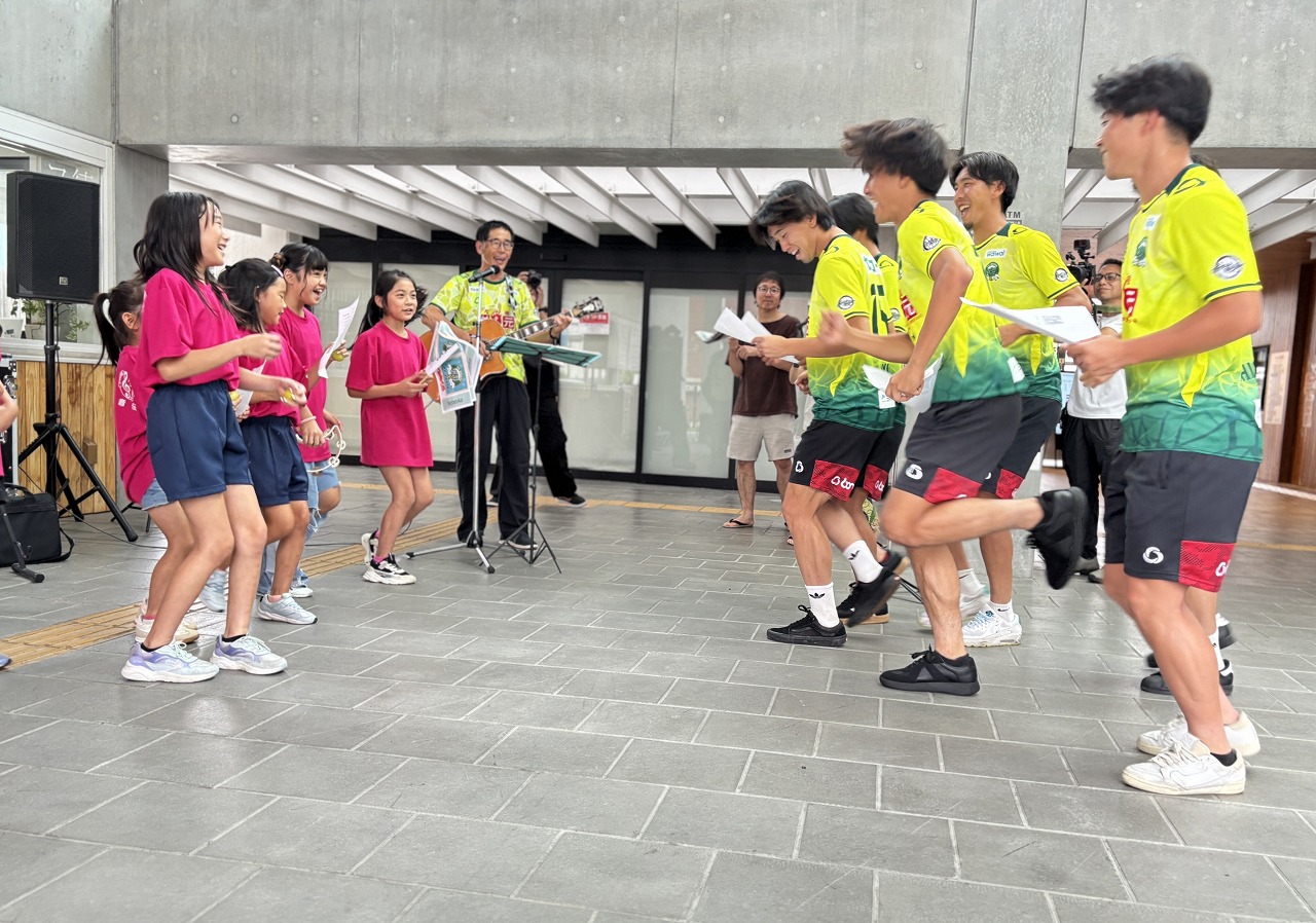 ギターの音色がする方へ向かうと、そこではFC延岡AGATAの応援歌をみんなで練習しているようでした。